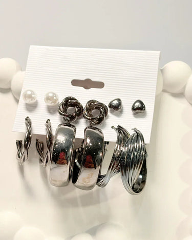 - 6-pair earring set featuring studs, hoops, and statement designs in polished silver tones
