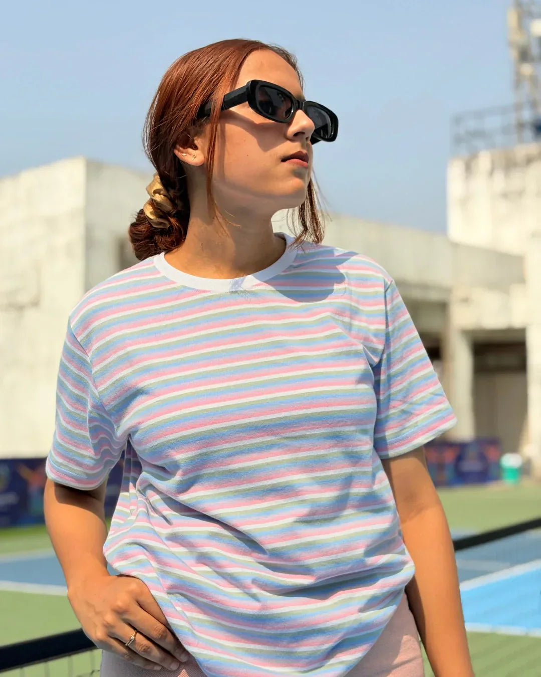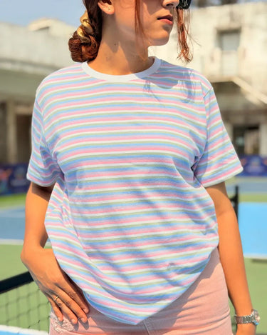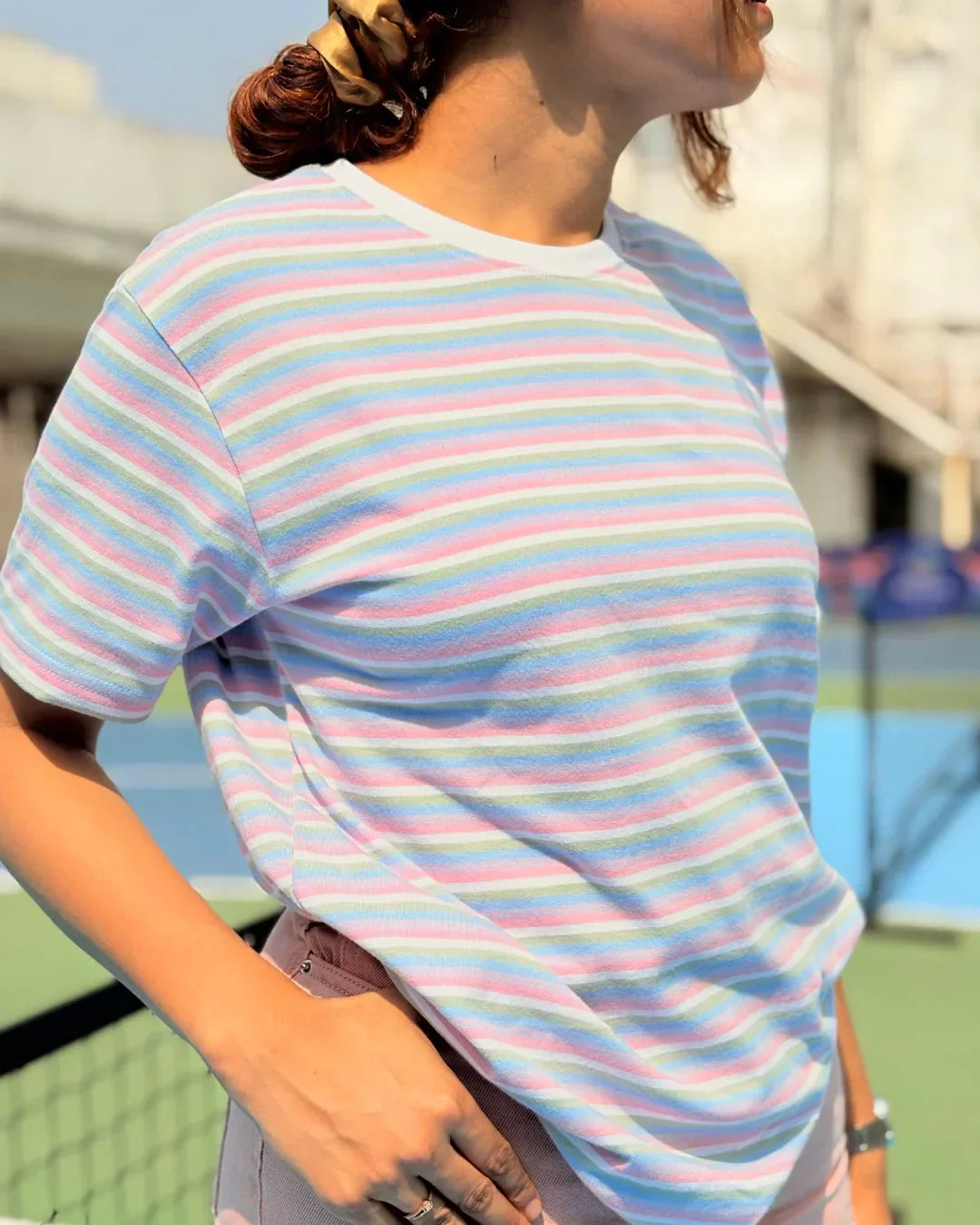 Bonus Hint: It's not just any tee; it's the perfect Retro Strip T-shirt for women. But shh, that's our little secret. 😉